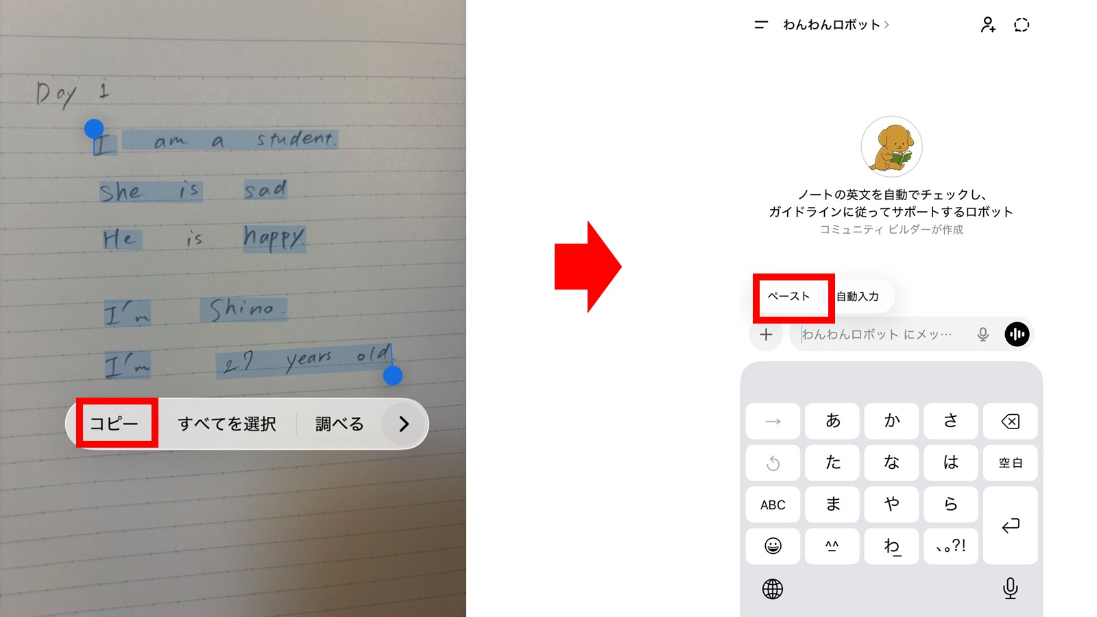 3️⃣わんわんロボの入力画面でをタップし、ペーストを押す