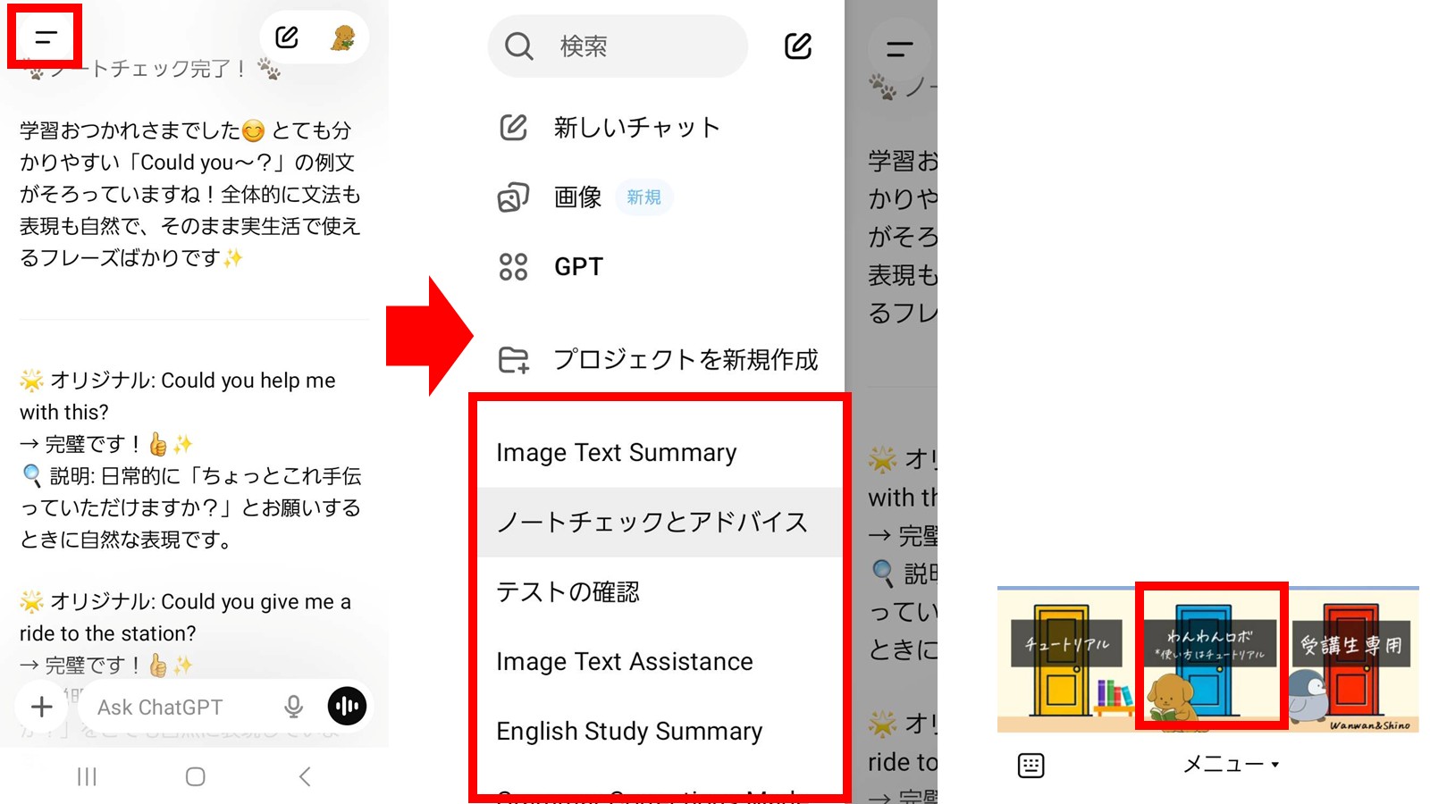 左上の日本戦を押すと、左側からメニューが表示されます。赤枠で囲ったあたりに、過去のチャット履歴が残ります。そちらを押すと、そのままわんわんロボを使うことが出来ます。